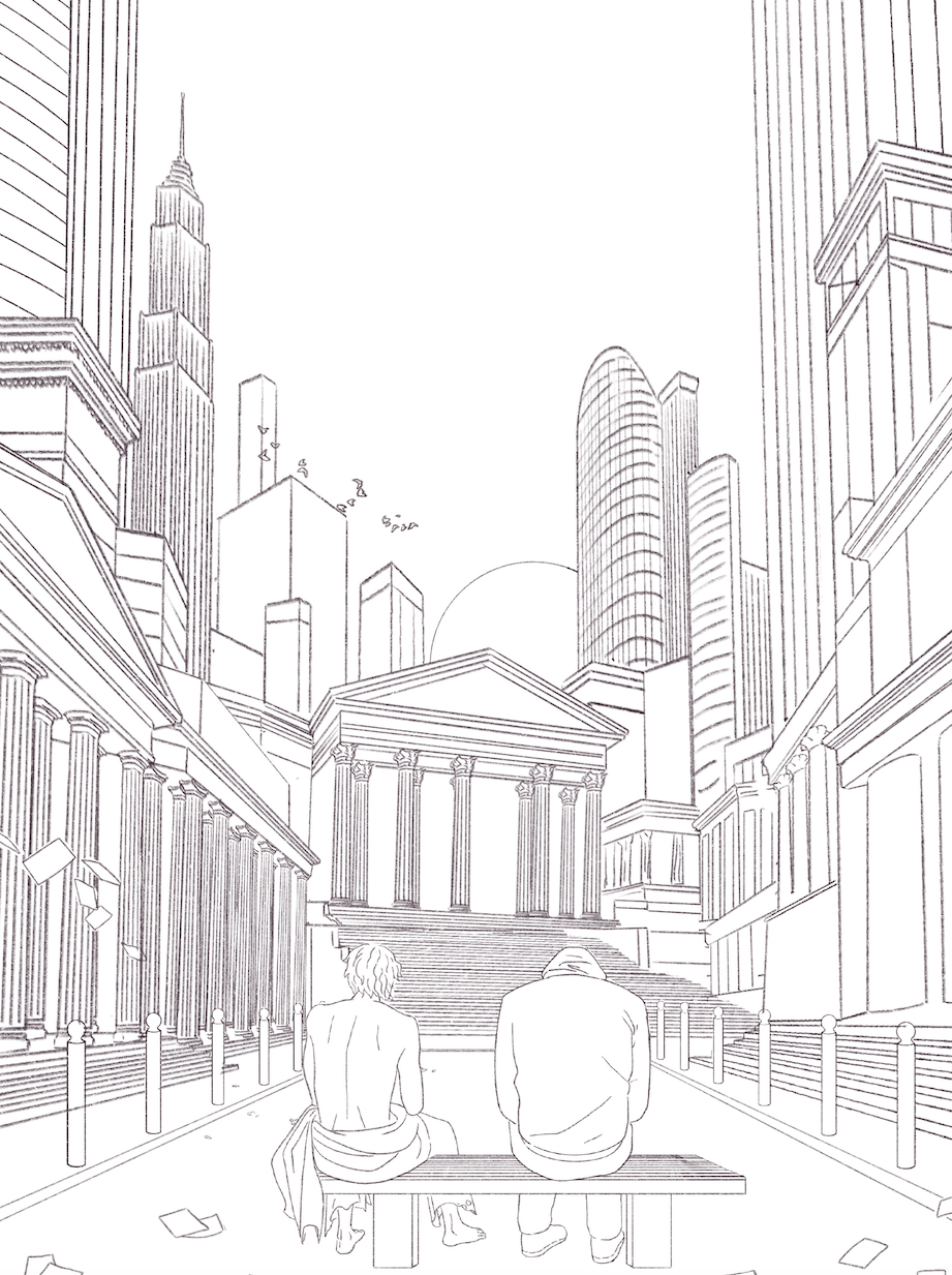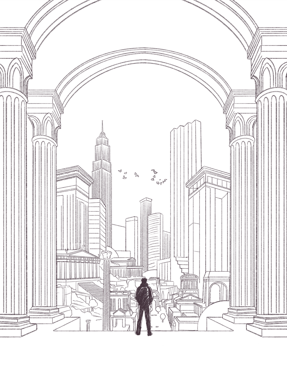 The brief called for a highly conceptual illustration capable of conveying layered ideas - from ancient architecture to modern urban environments - while maintaining legibility, atmosphere, and emotional impact. Our artist, Kevin Deneufchatel, focused on shaping clarity within this density, working closely with us to refine symbolism, composition, and visual hierarchy so that the illustration could be read intuitively by both academic and non-specialist audiences.