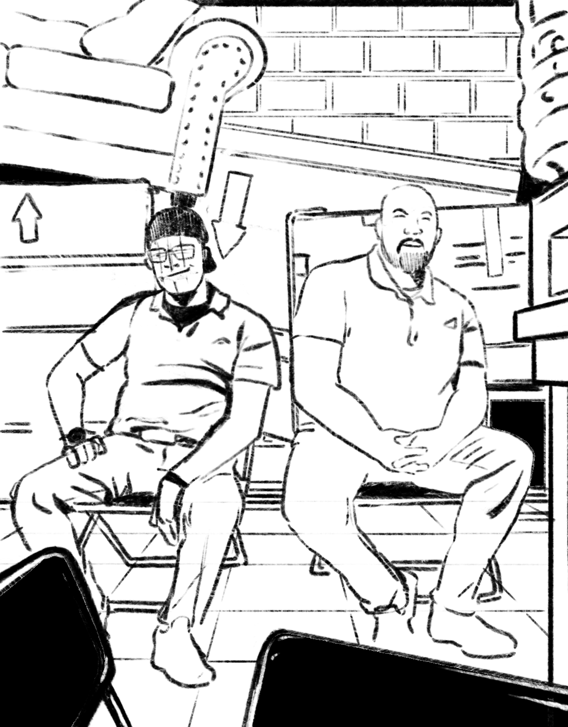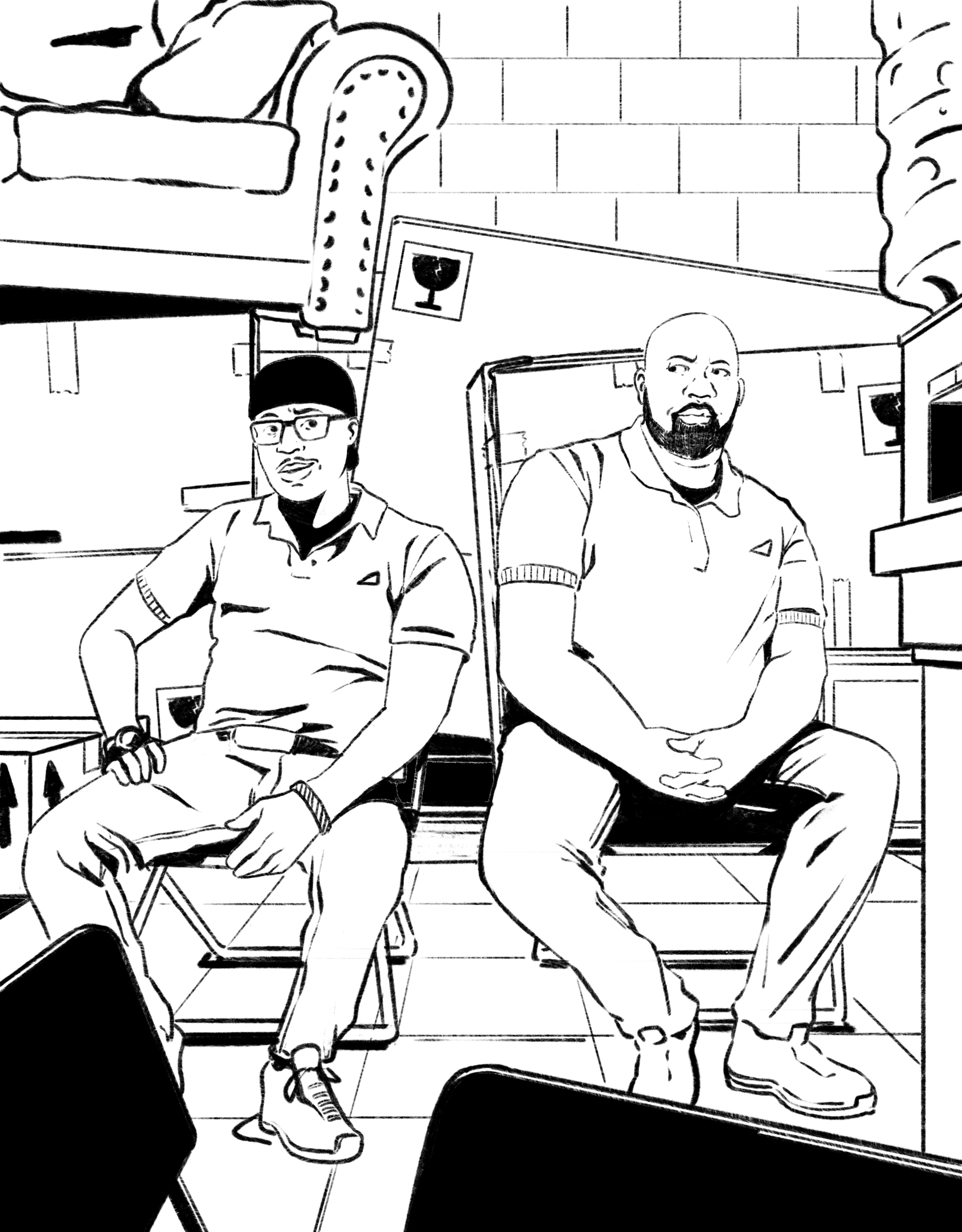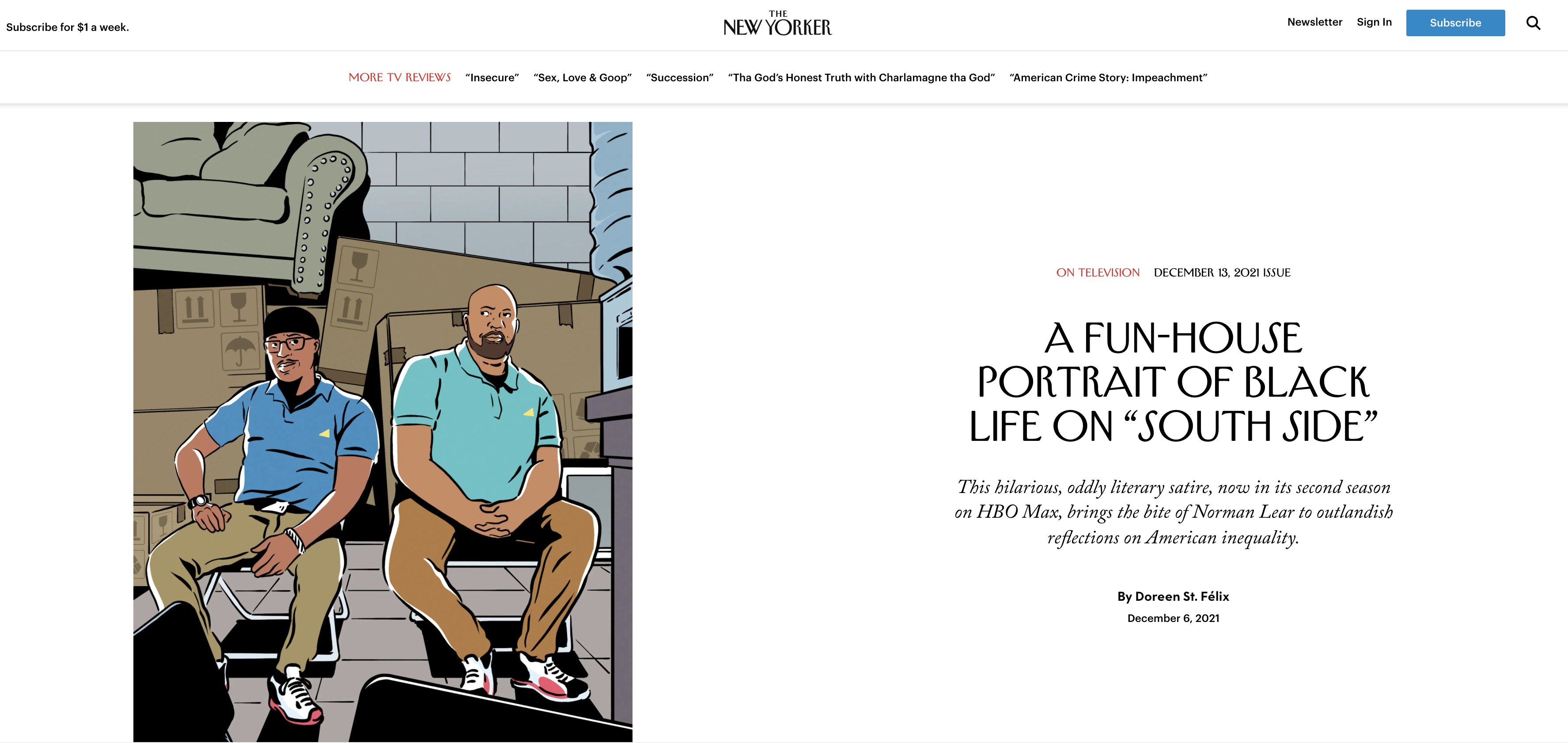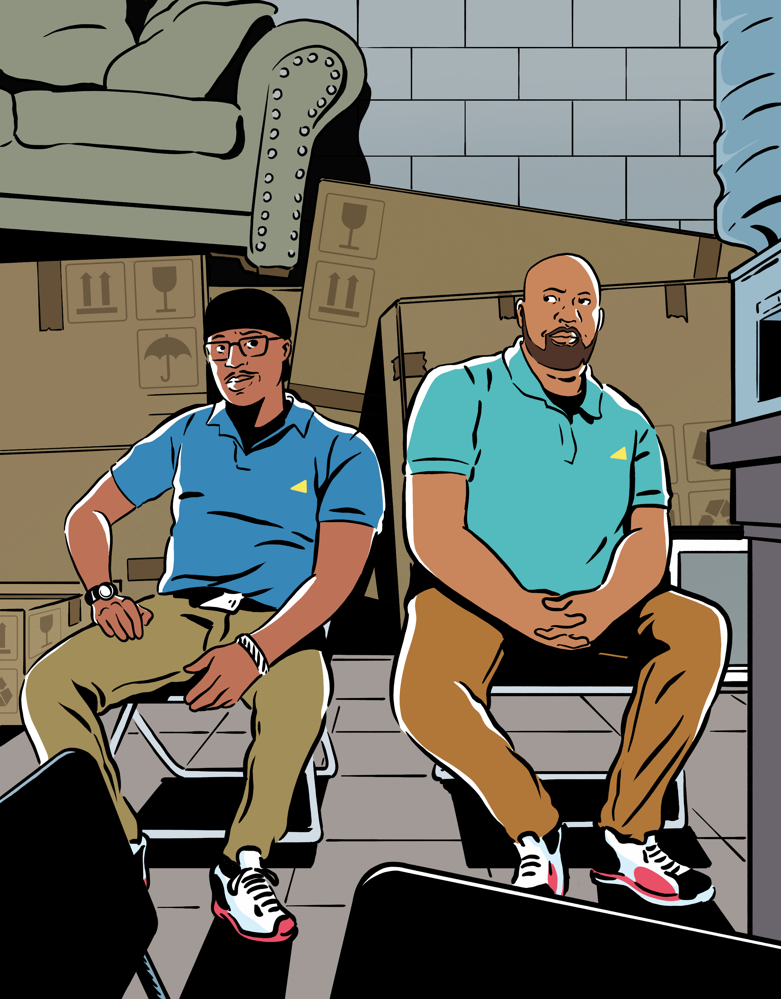 Gustavo avait déjà illustré pour leur article sur la série Netflix The Chair, dans lequel il avait créé une illustration haut de gamme de la star Sandra Oh, et ce projet récent était pour un autre article sur une série télévisée populaire, South Side de HBO MAX. South Side, avec Sultan Salahuddin et Kareme Young, est centrée sur deux diplômés d'un collège communautaire qui cherchent à réussir dans les affaires en travaillant dans un magasin de location-vente. Travaillant avec une nouvelle équipe créative au New Yorker, Gustavo a une fois de plus travaillé dans des délais serrés sur le projet, livrant les premières esquisses en moins de deux heures et, après quelques ajustements simples, Gustavo a reçu le feu vert pour commencer à ajouter de la couleur.